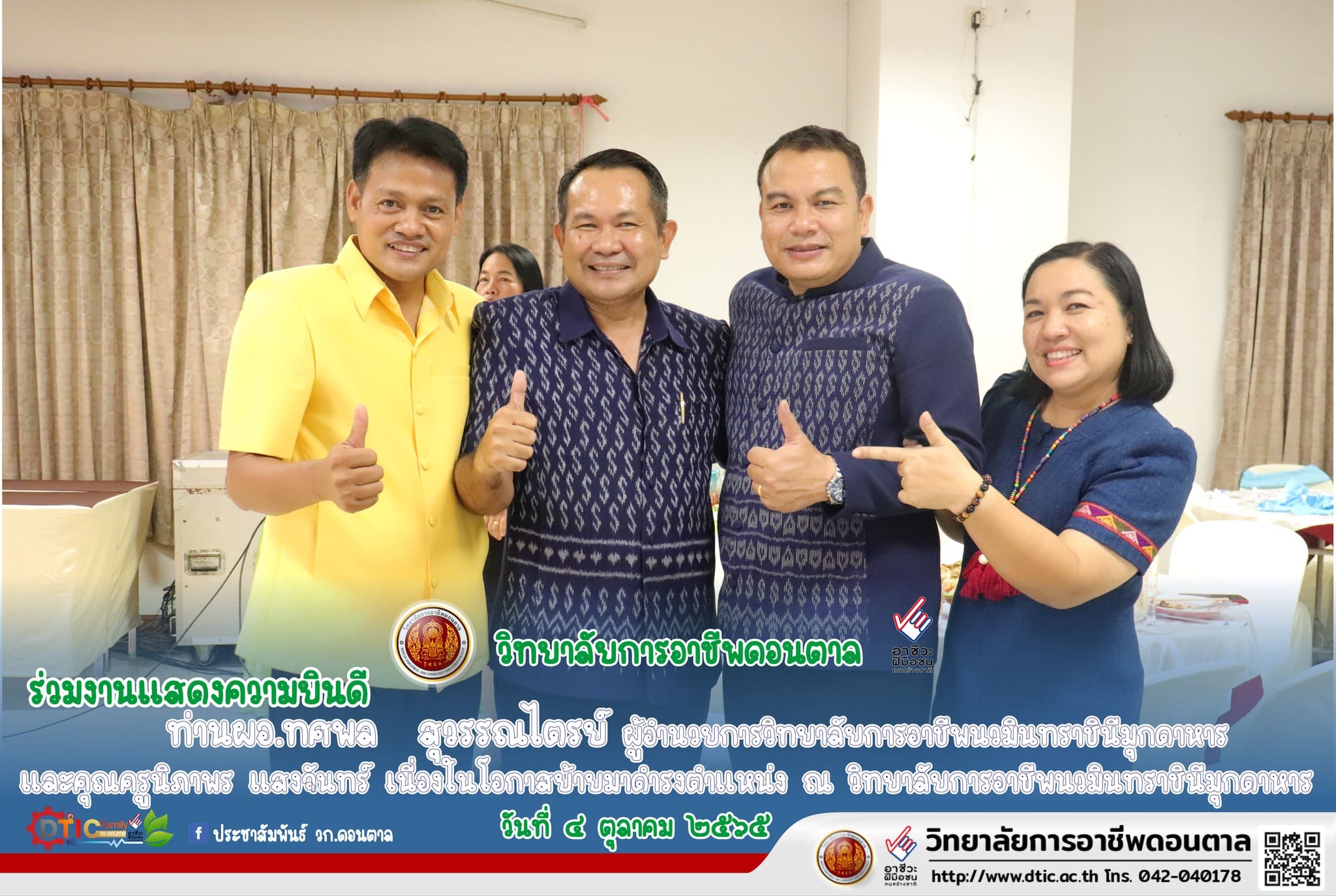วิทยาลัยการอาชีพดอนตาล นำโดยท่านผอ. พงษ์ศาสตร์ อภิธรรมพงศ์ ร่วมงานแสดงความยินดี ท่าน ผอ.ทศพล สุวรรณไตรย์ ผู้อำนวยการวิทยาลัยการอาชีพนวมินทราชินีมุกดาหาร และคุณครูนิภาพร แสงจันทร์ เนื่องในโอกาสย้ายมาดำรงตำแหน่ง ณ วิทยาลัยการอาชีพนวมินทราชินีมุกดาหาร 4 ตุลาคม 2565 |